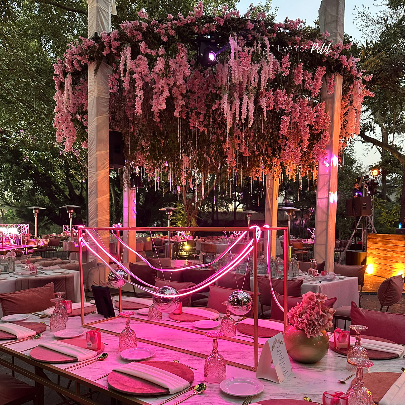 ¡Bienvenidos una vez más al blog de Eventos Petit! Nada nos llena más el corazón que revivir momentos como este: el primer baile de los novios bajo un impresionante techo floral iluminado. En esta captura nocturna, vemos a la pareja en el centro de la pista, rodeados de invitados emocionados, con luces cálidas, flores colgantes y un ambiente que parece sacado de un cuento de hadas.